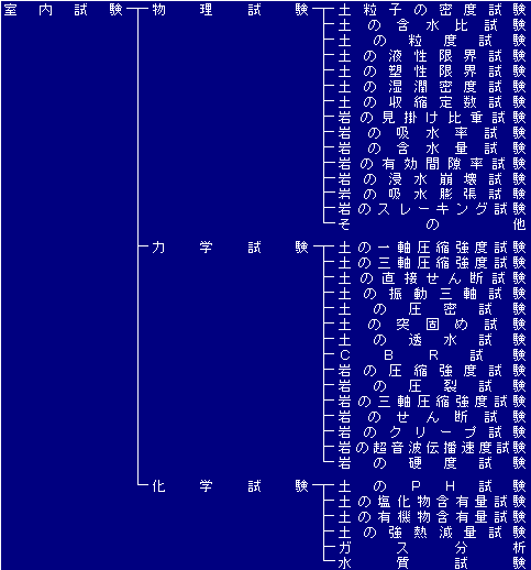 | ■地質調査のフローチャート /室内試験 現地調査より採取された不攪乱試料(乱さない土)、攪乱試料(乱した土)を用いて、地盤状態を再現するなどの手法を用いた室内土質試験を実施する。 |
